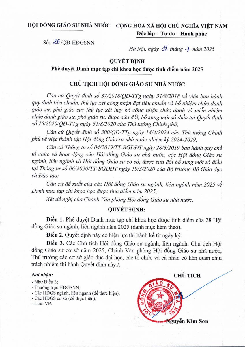 Quyết định số 26/QĐ-HĐGSNN phê duyệt Danh mục tạp chí khoa học được tính điểm năm 2025